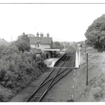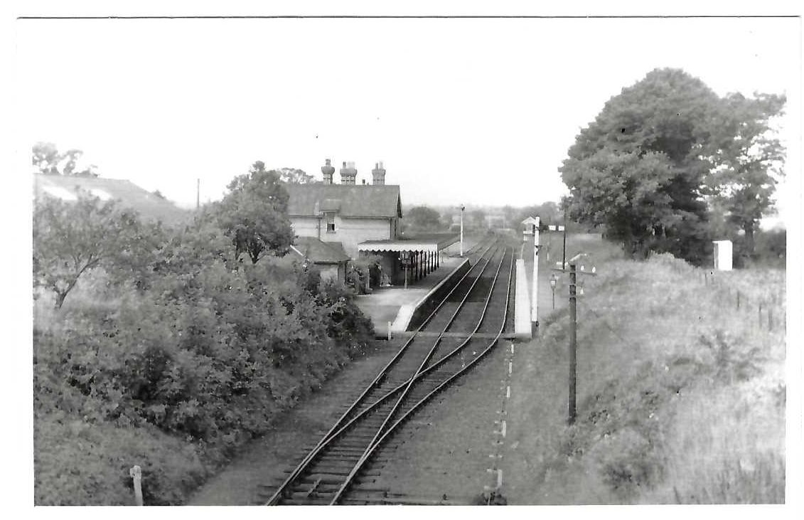 The platforms at the London and North Eastern Railway (LNER) Reepham Station taken from or near the railway bridge at the junction of Cawston Road and Wood Dalling Road. There are no hedges, unlike the the overgrown embankments that line the Marriott's Way today in 2022.