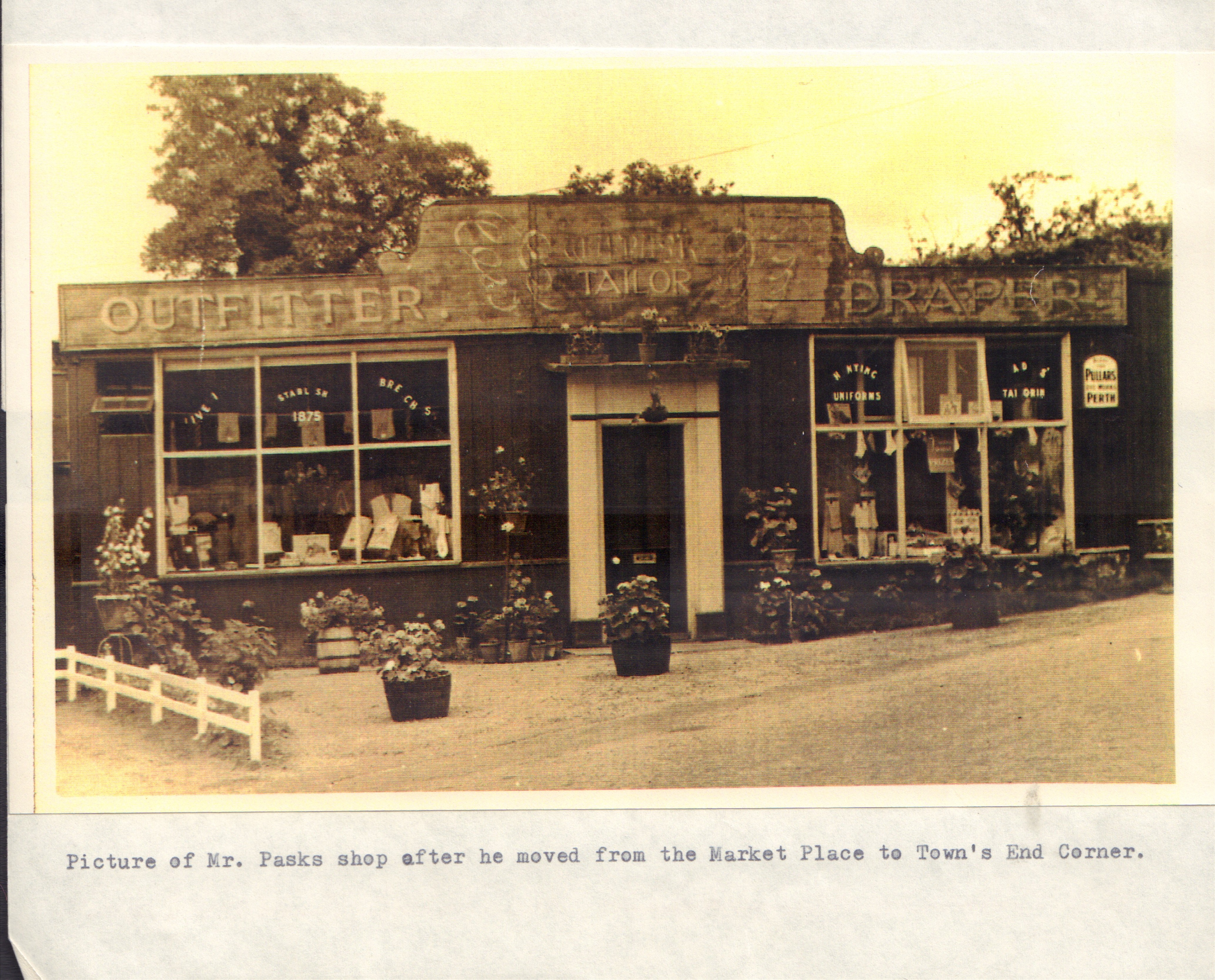 Picture of Mr. Pask's shop after he moved his business from the Market Place to Towns End Corner. The signs read: Outfitter, Master Tailor, Draper.