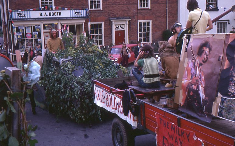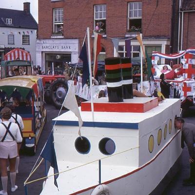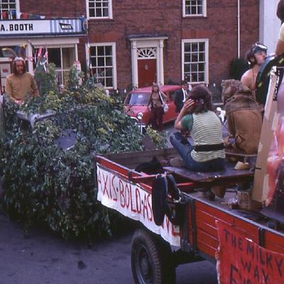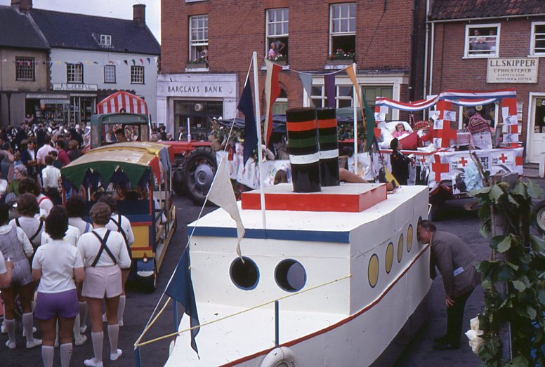 5 colour photographs of the Reepham Carnival held on 12 June 1971. The Brownie in the first picture is Mrs. Grant, others in the photograph in fancy dress on the float are Ellen/Eileen Rowe and Pam Swayze. The other two photos are of floats assembled in the Market Place.