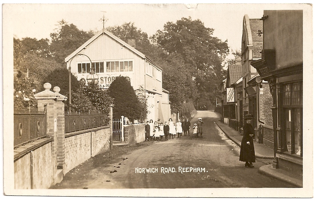 View of Norwich Road looking towards Booton. The white building was the storage for George Storey, painter & decorator. In the right foreground is Jesse Bircham's chemist shop & further along is the sign for George Grey's shop where he made & repaired boots.