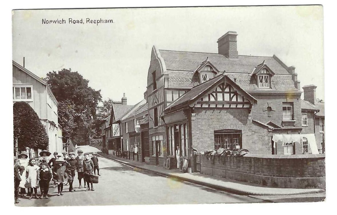 View along Norwich Road with schoolchildren on left, saddler's shop on right and Gray's bootmaker shop further down the road.