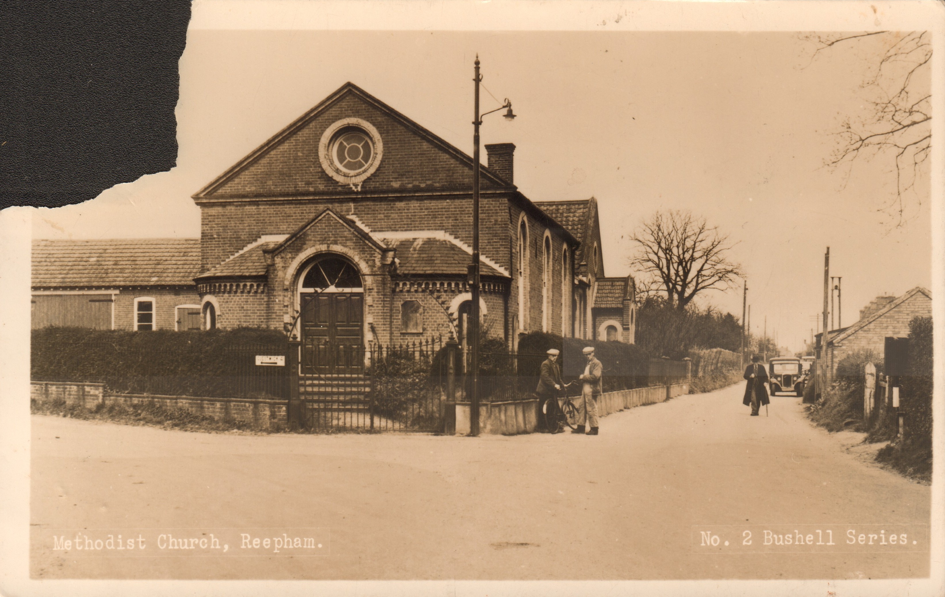 Postcard of the Methodist Church on Station Road. Left top corner torn off (by a stamp collector?). Probably taken after 1935, the date of Methodist Union. Note the street lamp.