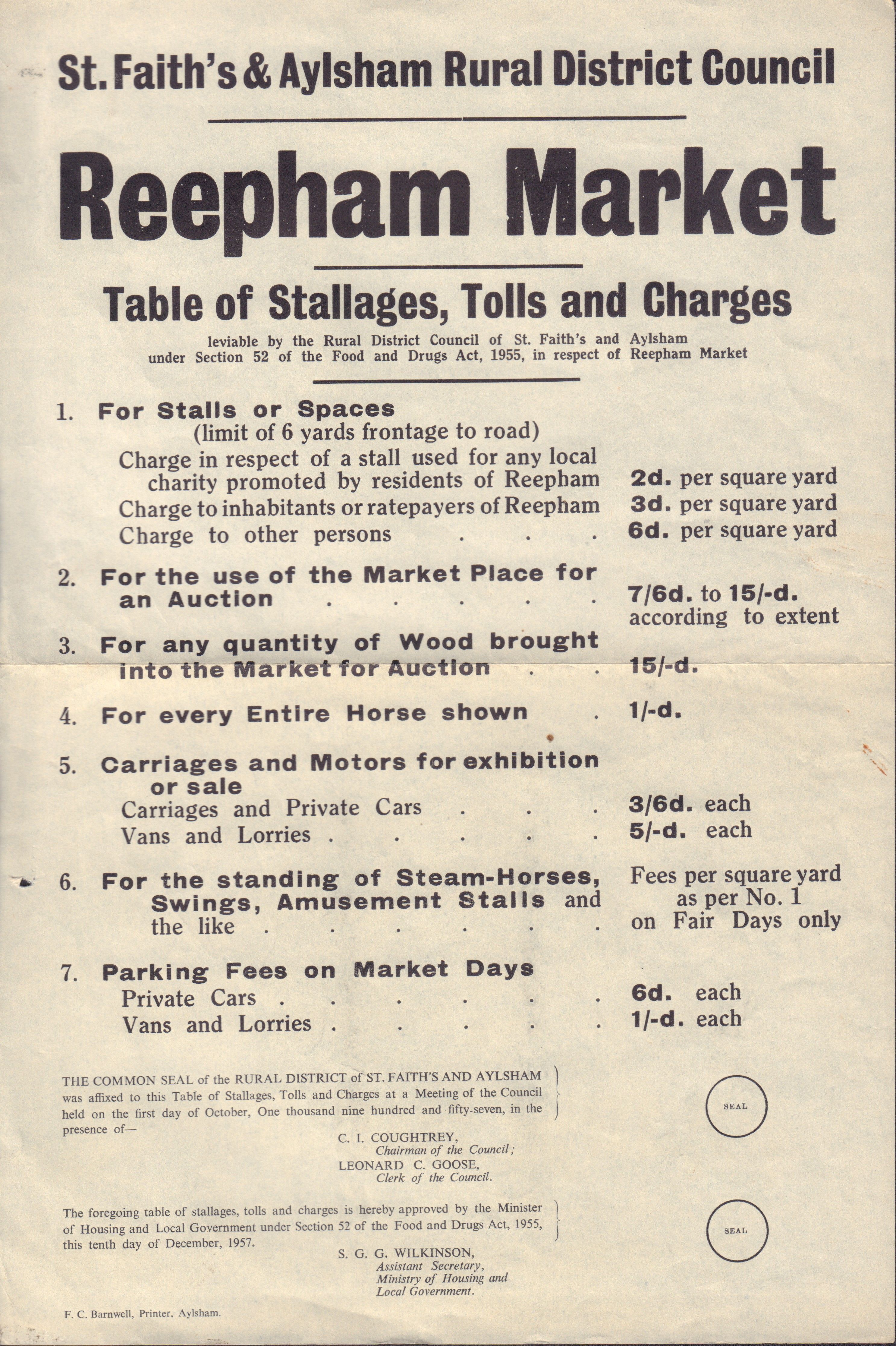 Detailed list of charges to be paid to St. Faith's & Aylsham Rural District Council for various activities in Reepham Market Place on Market & Fair Days.