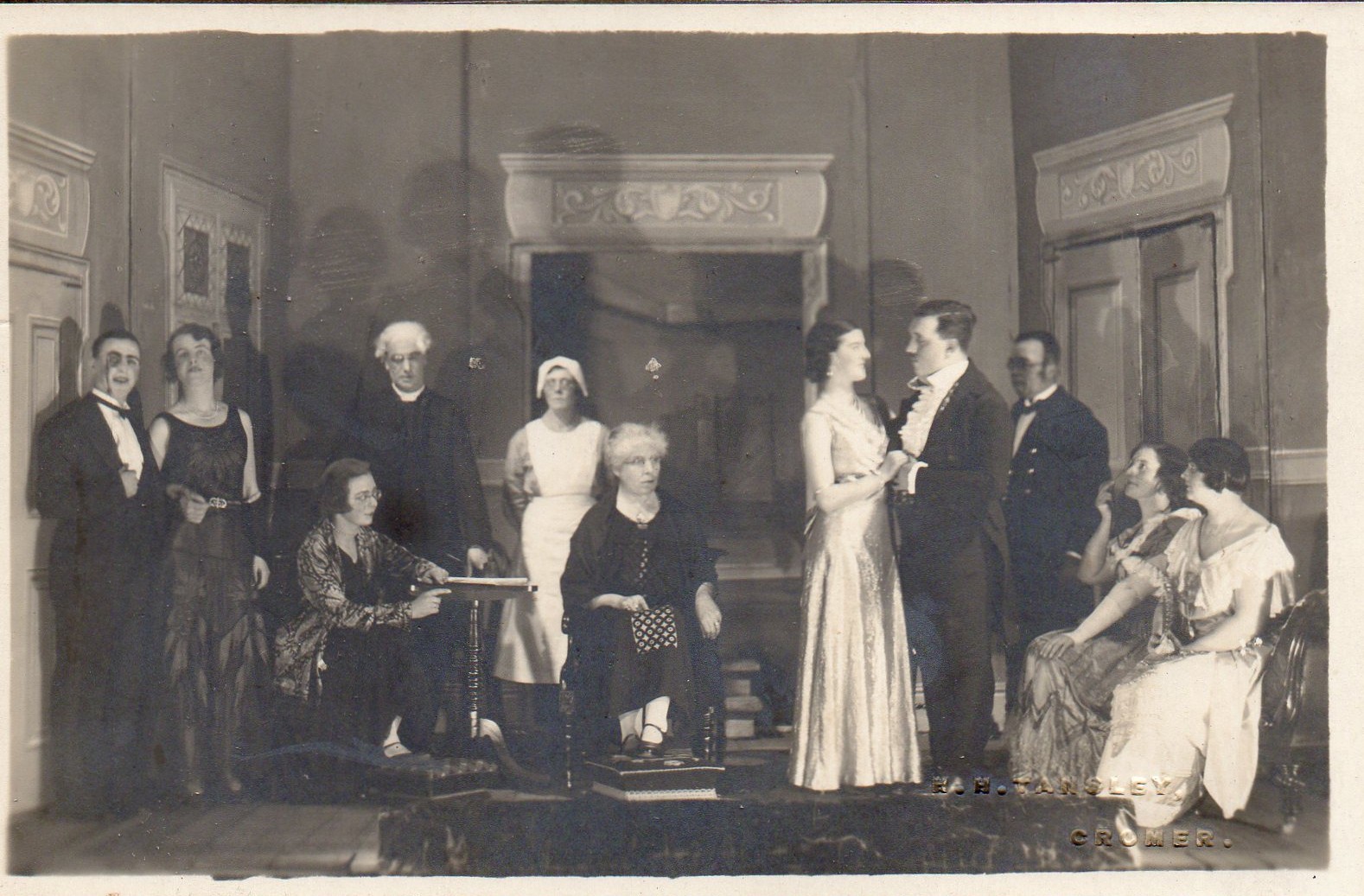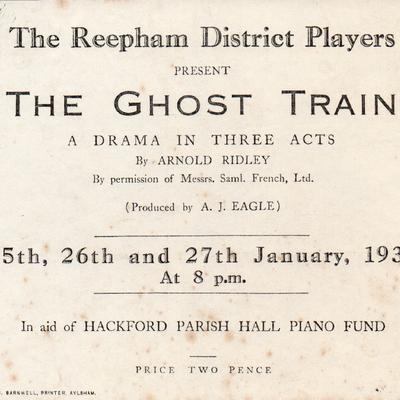 Collection of programmes, reviews and a few images from the Reepham & District Players in the 1930s. The reviews identify some familiar names e.g. Evelyn Gibbs & her siblings Edward & Marjorie, & Sidney Eglington as Stage Manager. Printing for several items by Barnwell in Aylsham (they exist today) & later ones were published by D. Kendall Chapman. The first production was Brown Sugar. Performances probably took place in the current Town Hall, still called Hackford Parish Hall in the early 1930s. Image from one of the productions shown here together with a programme for The Ghost Train.