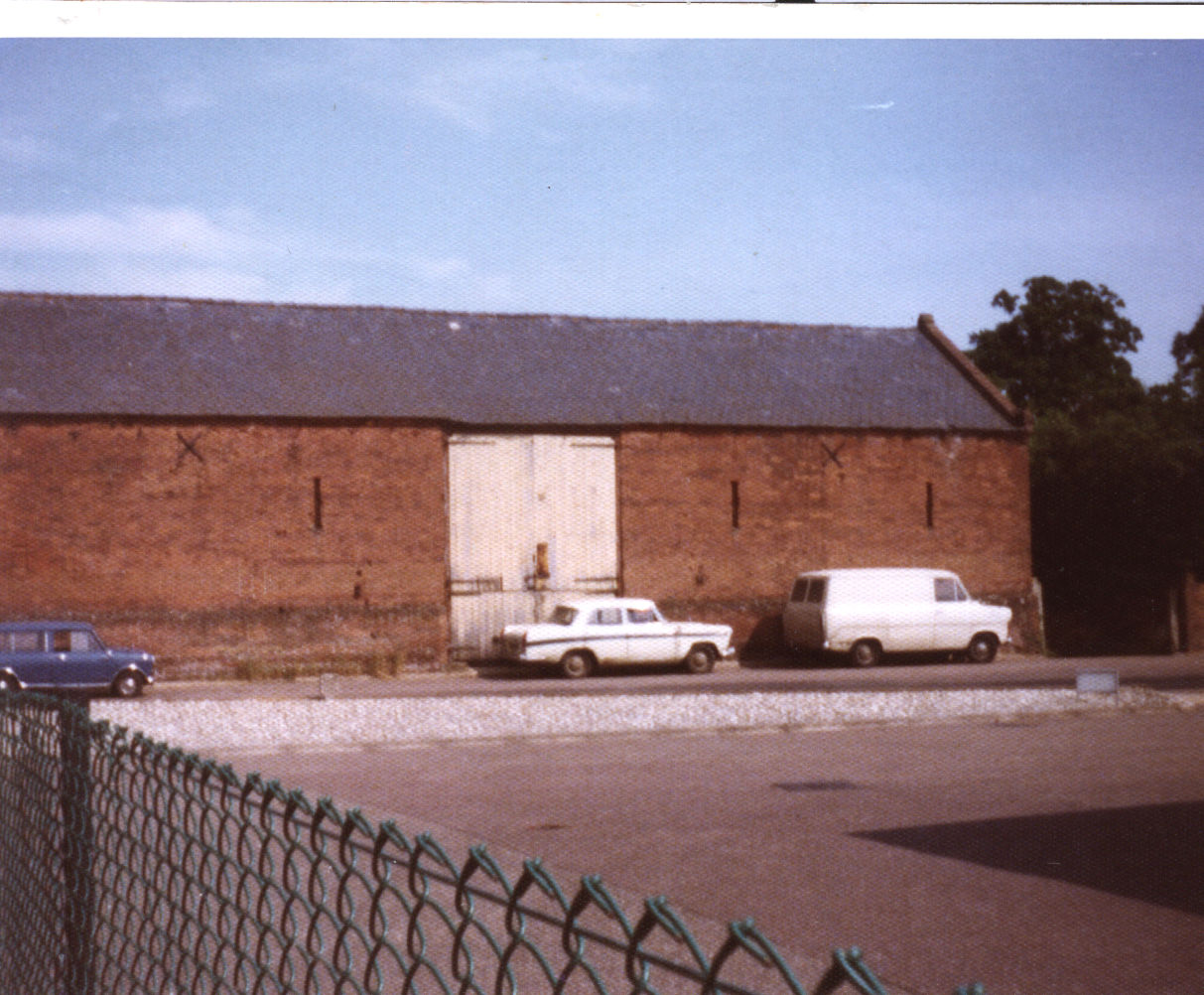 Colour photograph of the huge barn that stood on School Road where there is now modern housing. In the foreground is the area in front of the fire station. This was once a large pit or pond called Sun Barn Pit, famously used by an elephant in the early 1900s when a circus (or menagerie) came to Reepham. The pit was also used to fill the old steam fire engine used by Reepham Fire Brigade.