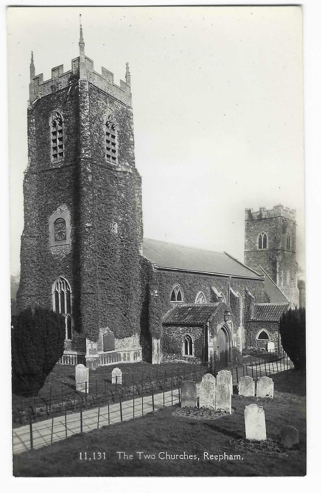 Image of St. Michael's & St. Mary's. Church tower and most of walls covered in ivy. Clock in place. Railings along the pathway.