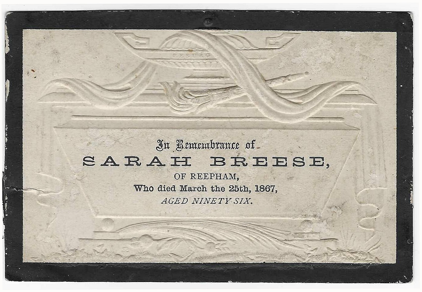 Remembrance card for Sarah Breese who died in 1867 aged 96. At the time of her death she was living with her daughter Mary in Norwich Road. Her husband Matthew died in 1840. Sarah, her husband Matthew and their daughter Mary are all buried in Reepham Cemetery (Whitwell Road).
