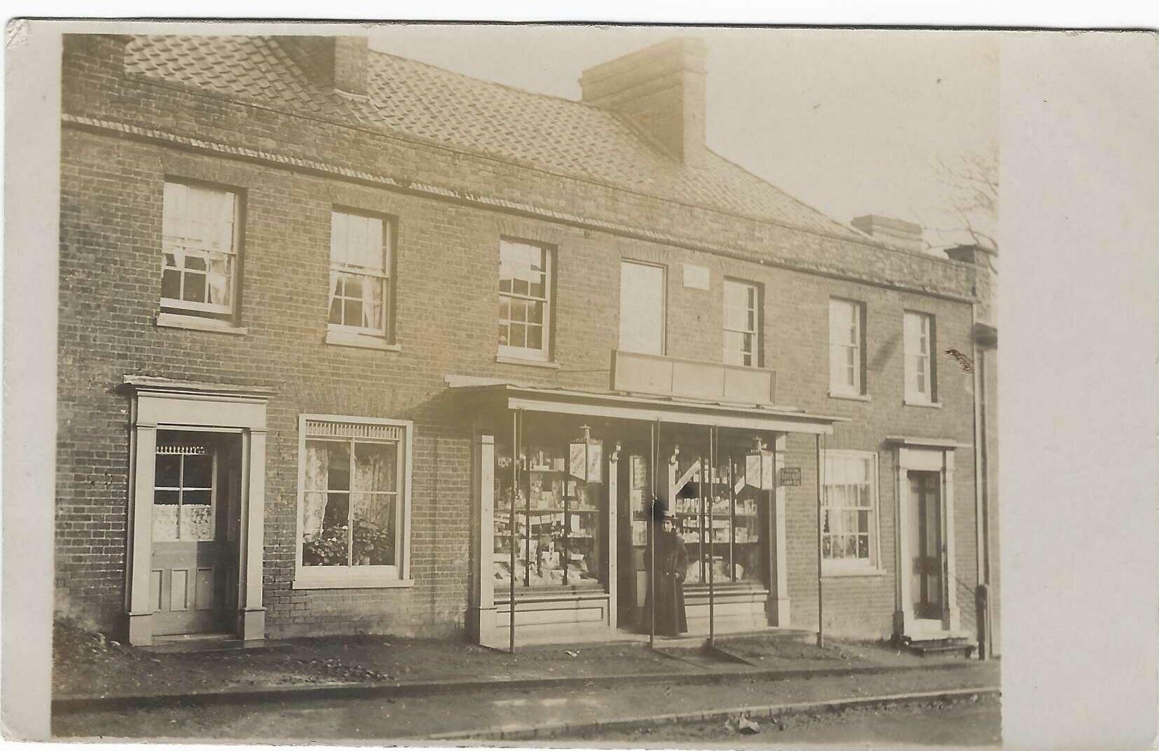 Image of the terrace on the north side of the Market Place that currently contains the shop and post office. It shows the original format of a central house/shop with a smaller house/cottage on each side. The reverse of the postcard states 'Howard shop'. By the 1920s it was Millers store.