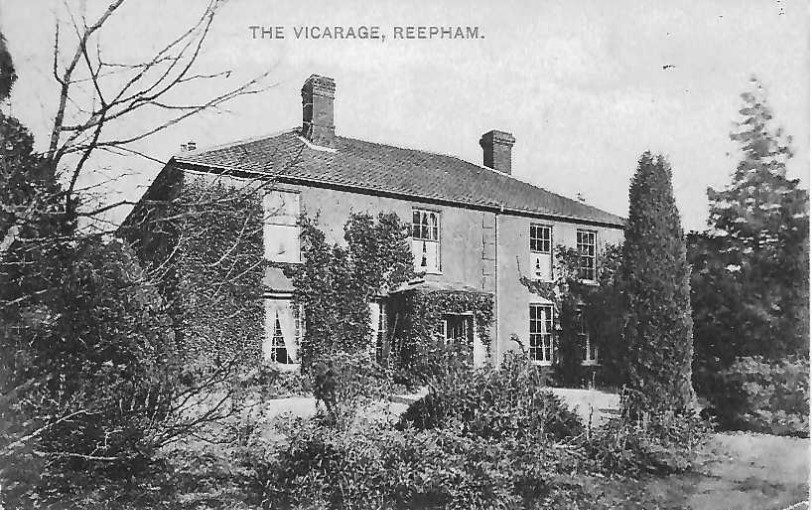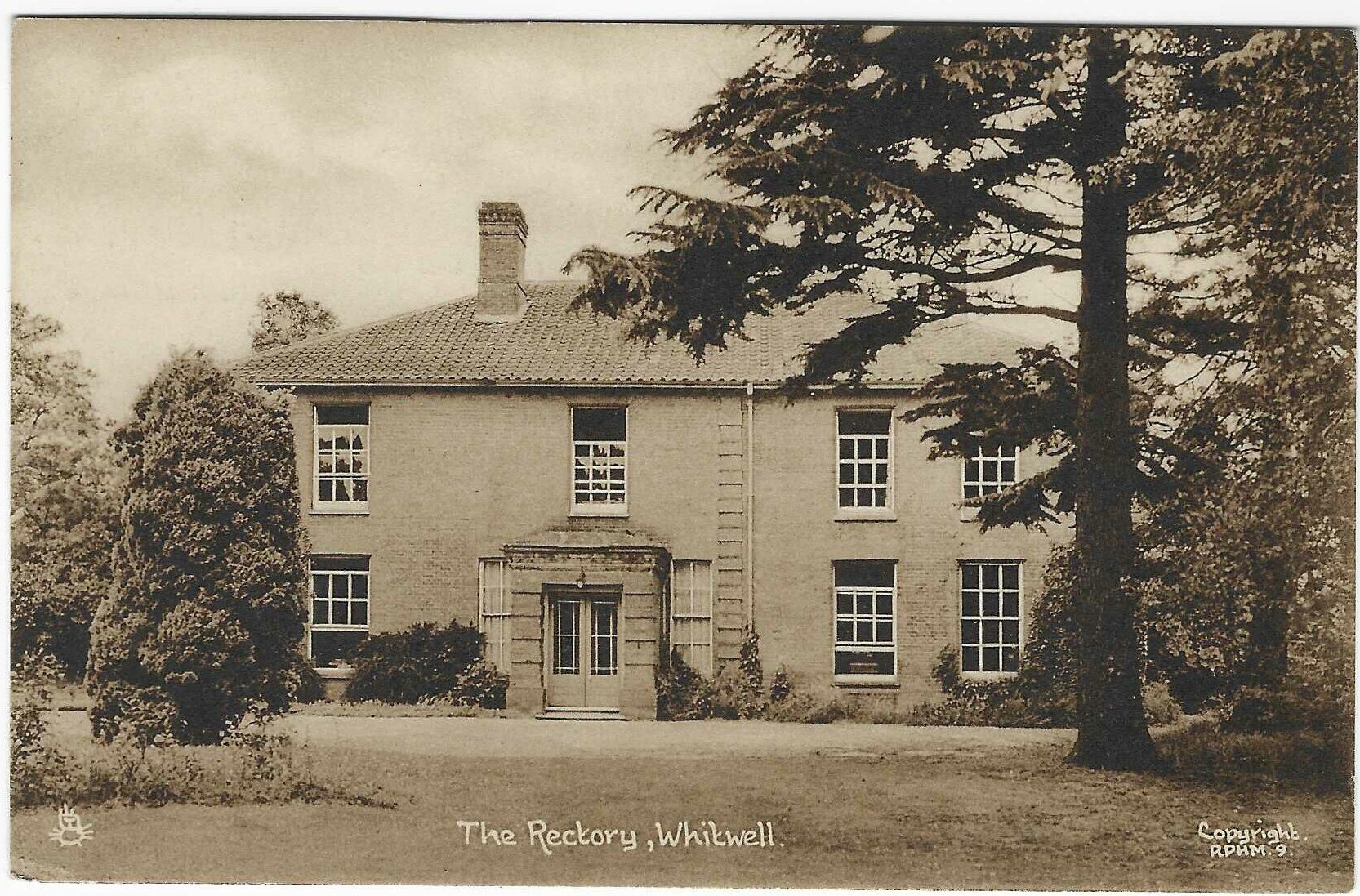 A Tuck postcard of Whitwell Vicarage on Mill Road (here called The Rectory) which first appears in the 1881 census occupied by Rev W. H. Freeman. The house may have been built in the mid-1870s. The second postcard is a copy- the original would have had red lettering.
