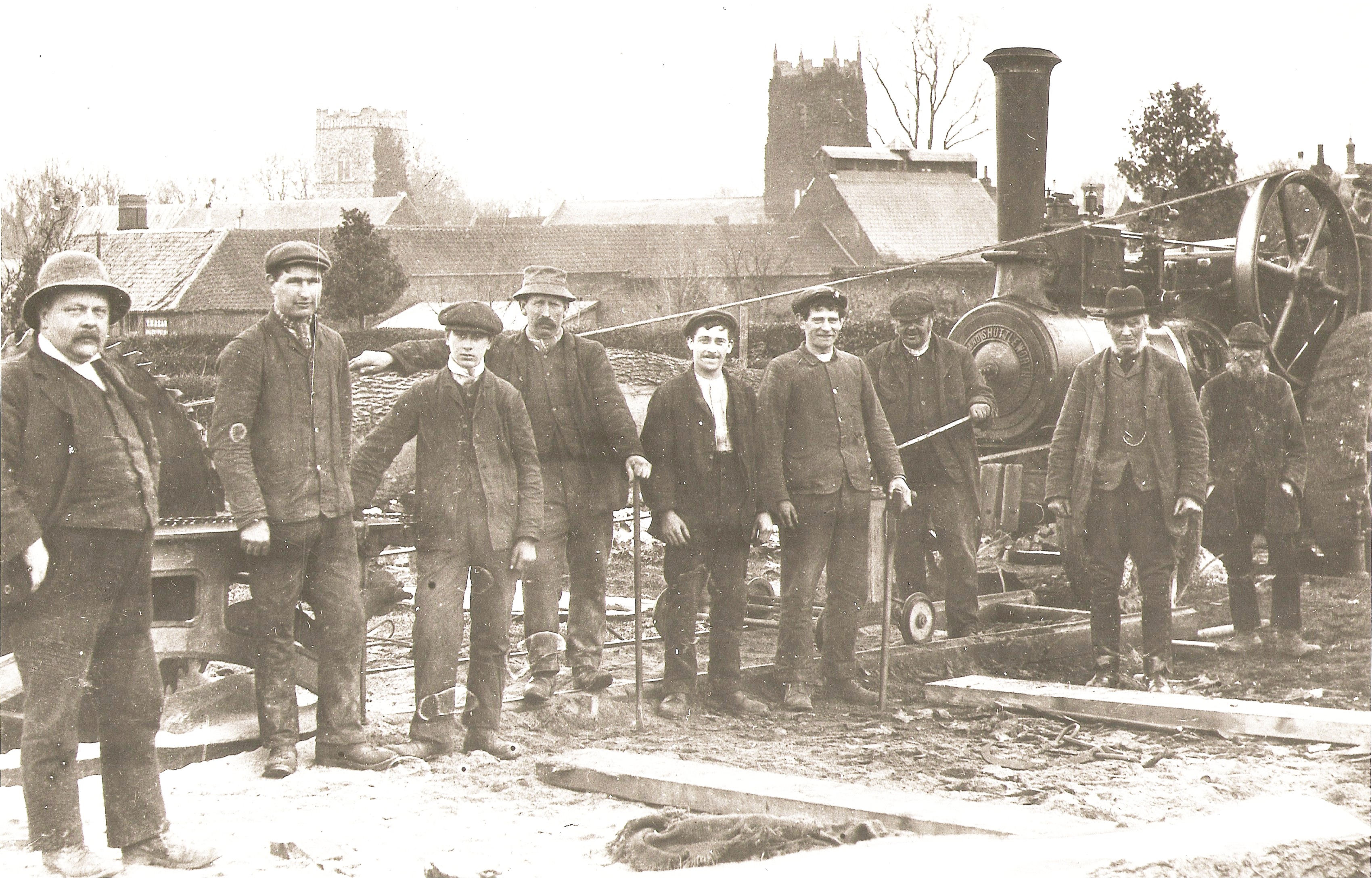 The view of the church towers in the background suggests that this is the workyard on the site of the current Spar shop and the yard behind it. Sidney Eglington is on the left, the older man in the three-piece suit may be Robert Parker Gooch who died in 1907. The steam engine would have been supplying power to run a circular saw for cutting logs as a preliminary process of the wheelwright business and making carts and traps.