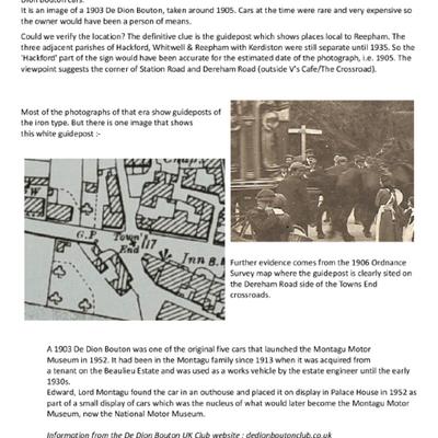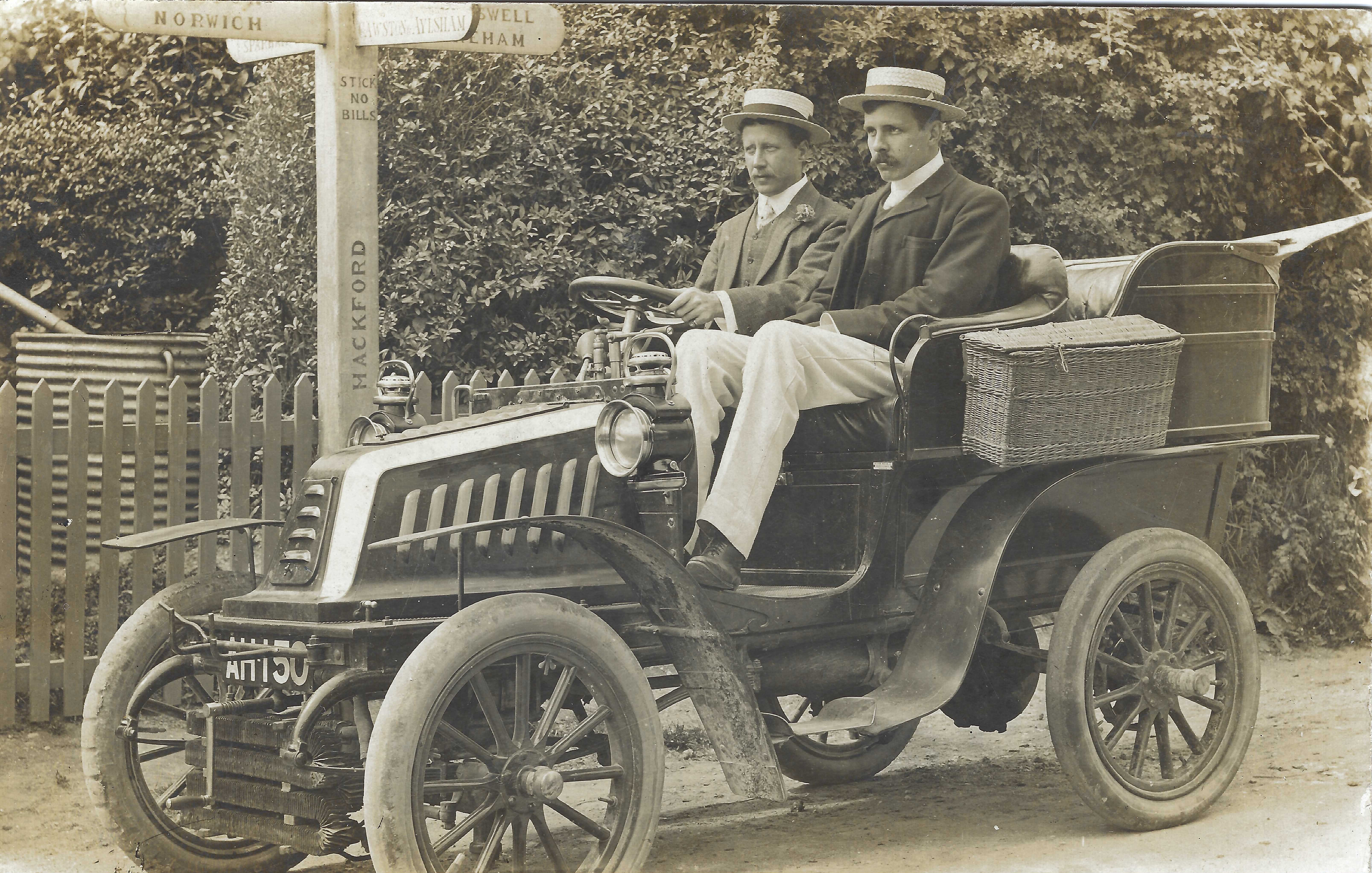 Image of two very smart young men in a De Dion Bouton car, taken at the bottom of Dereham Road.