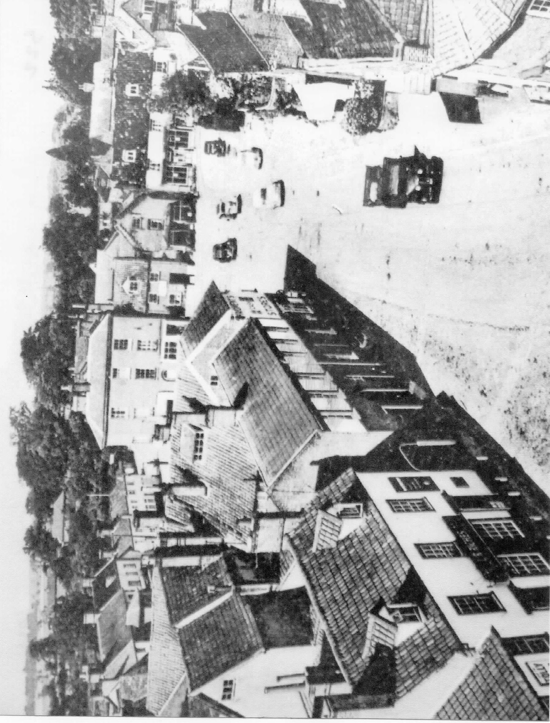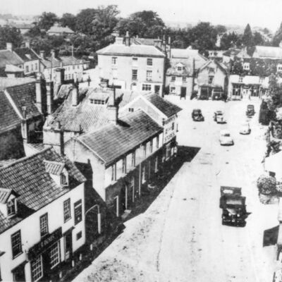 Discoloured photo shows a few scattered cars and a lorry. Shop signs include Riches & Hardiment's.