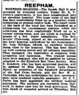 Newspaper cutting describing the facilities provided for wounded soldiers who began arriving in Reepham to recuperate in November 1914.