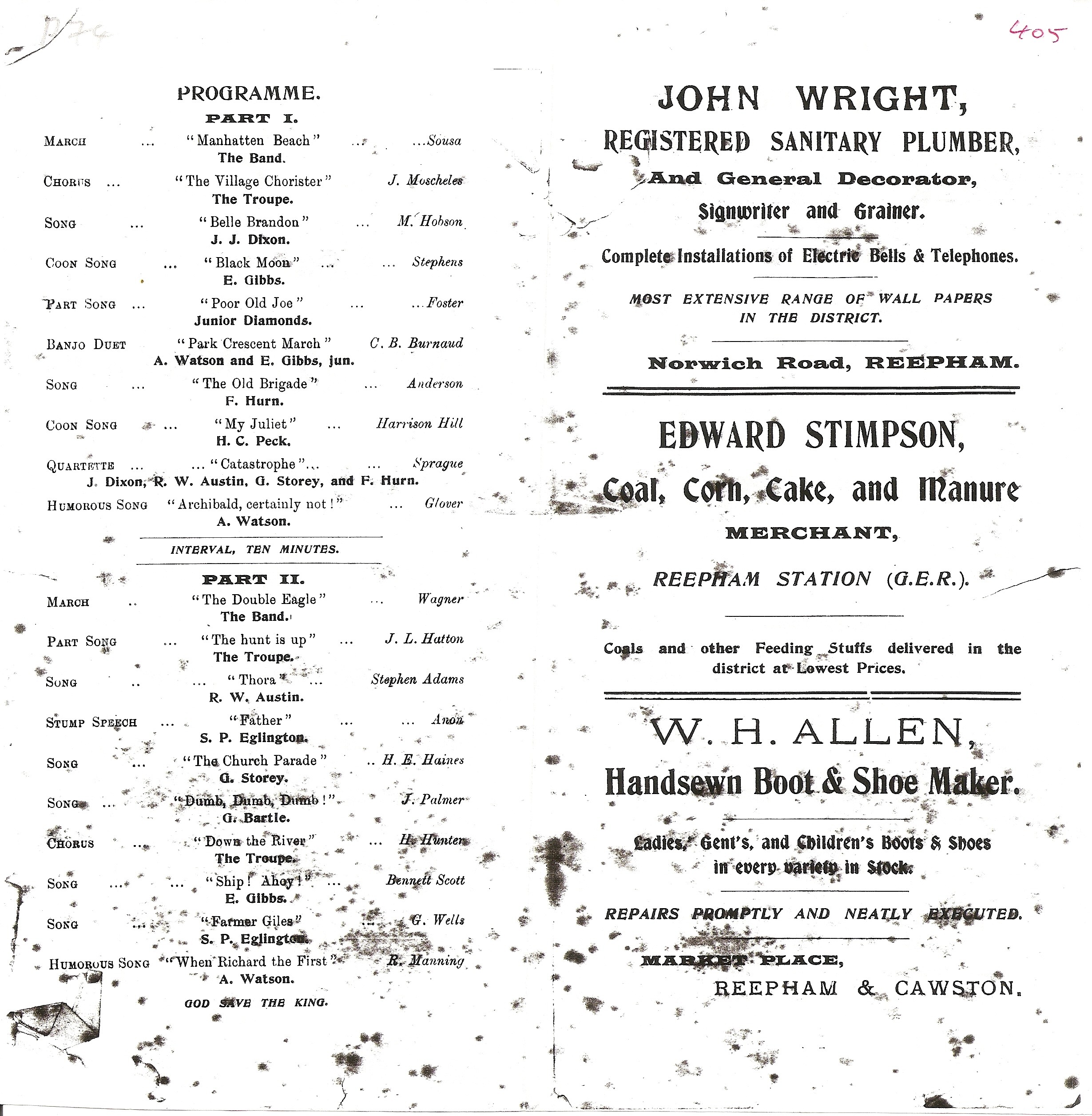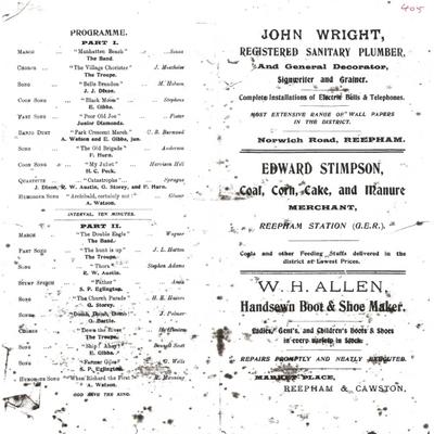 John Wright, plumber, Edward Stimpson, coal merchant, & W.H.Allen, boot & shoe maker, all have adverts in the programme.