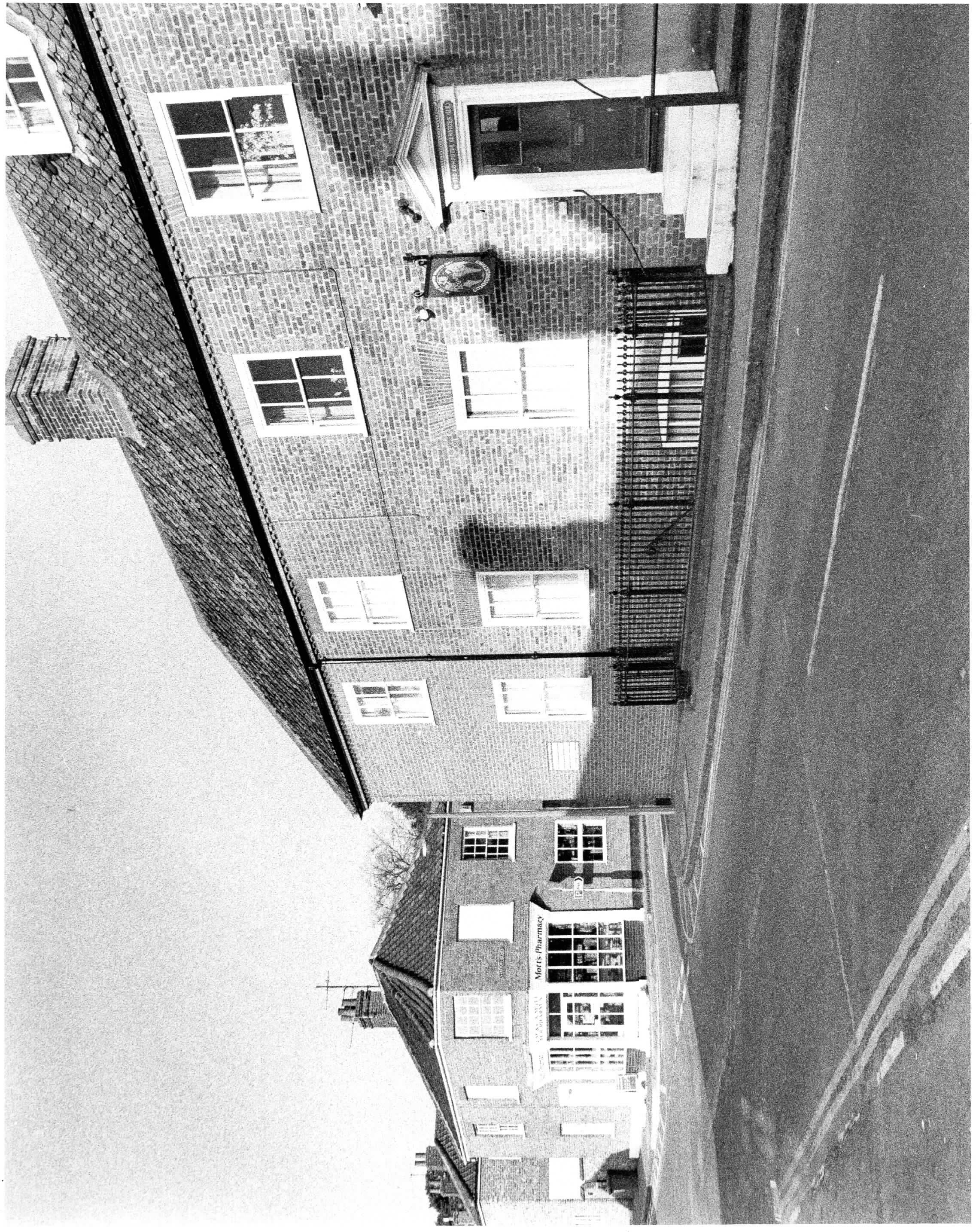 B&W photo of M-Tec premises in part of former Gibbs shop. Illuminated hanging sign ouside. Motts Pharmacy on Corner.
