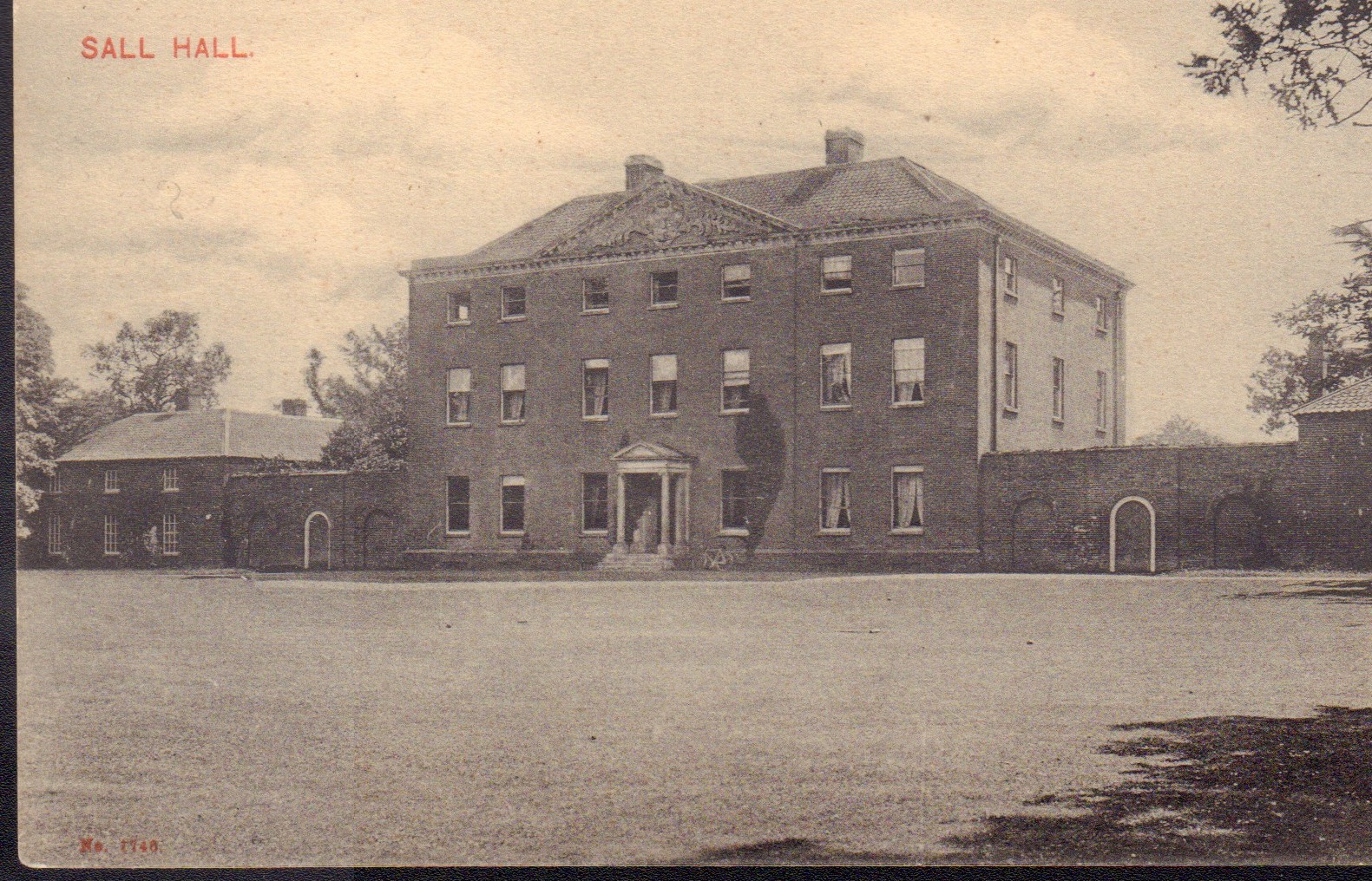 B&W unused postcard of the front of Sall Hall in early 1900s.
