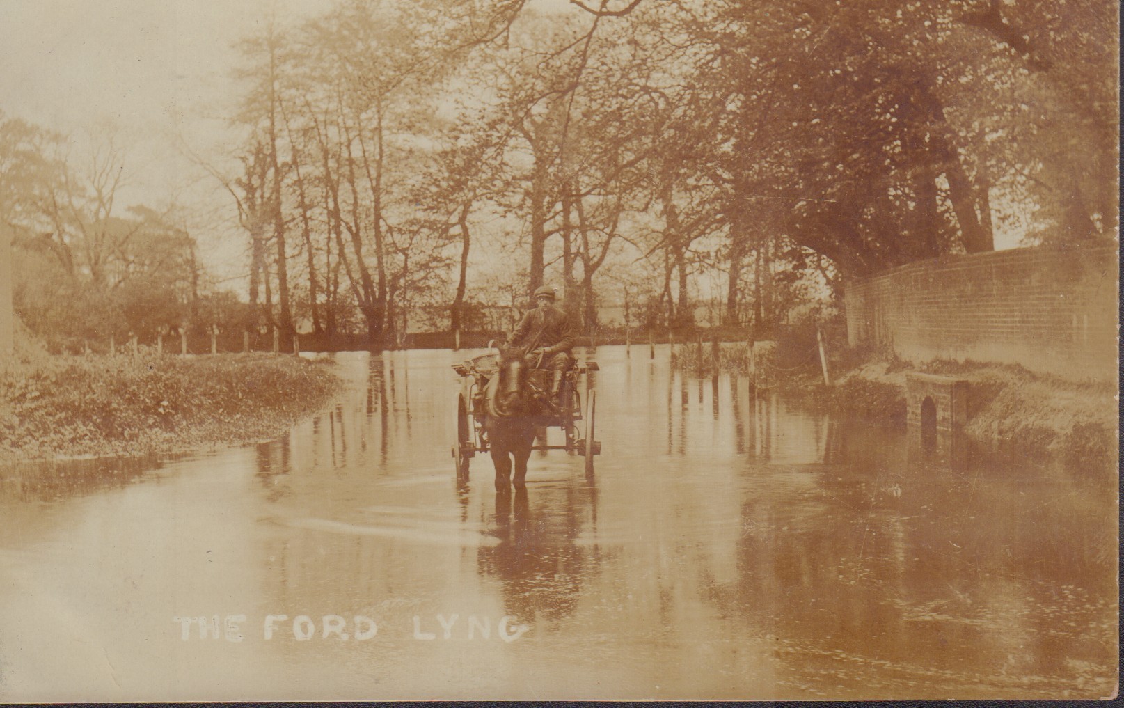 A horse and cart being driven through The Ford at Lyng.