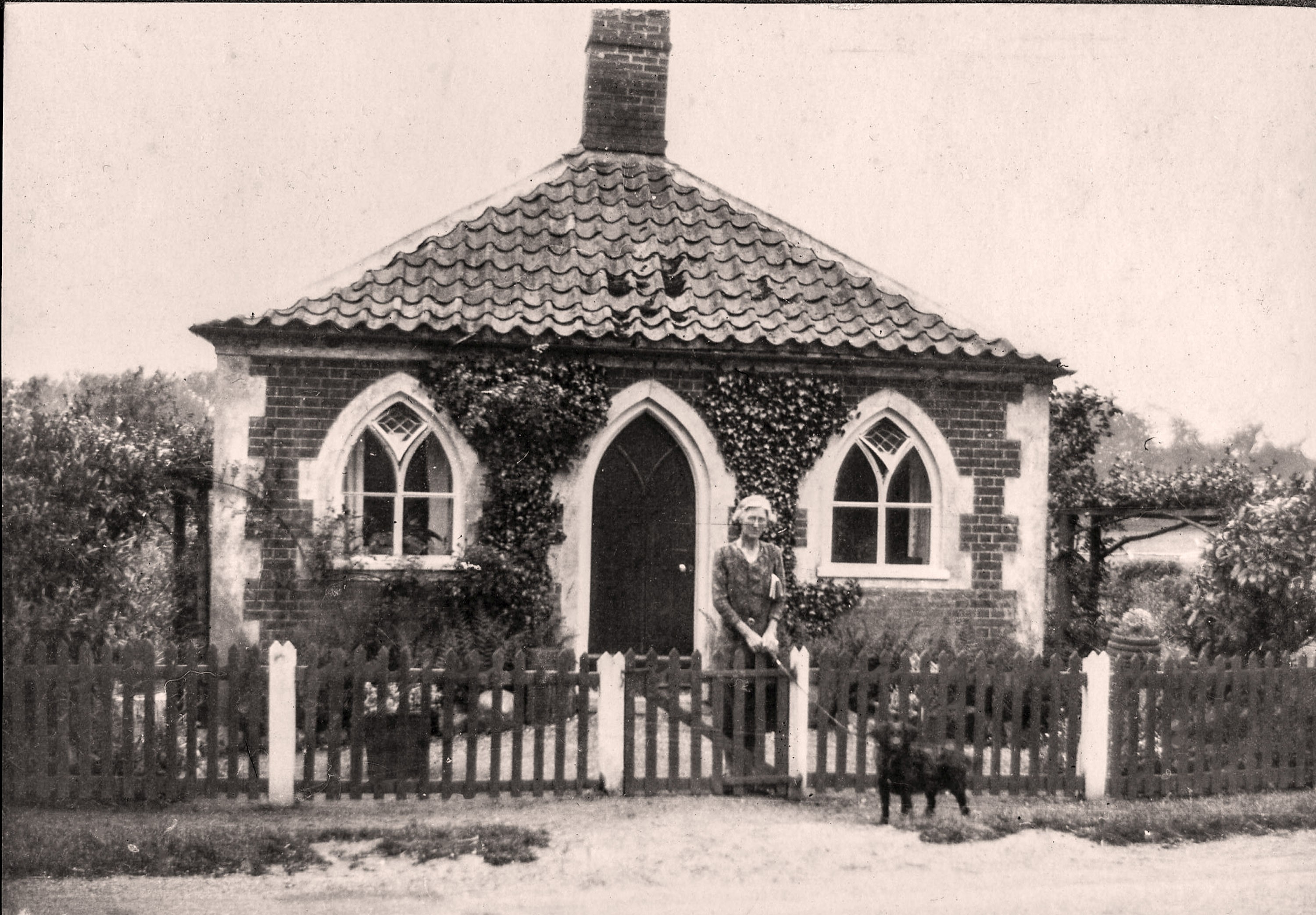 Unknown lady and her dog outside one of the four lodges at Salle.
