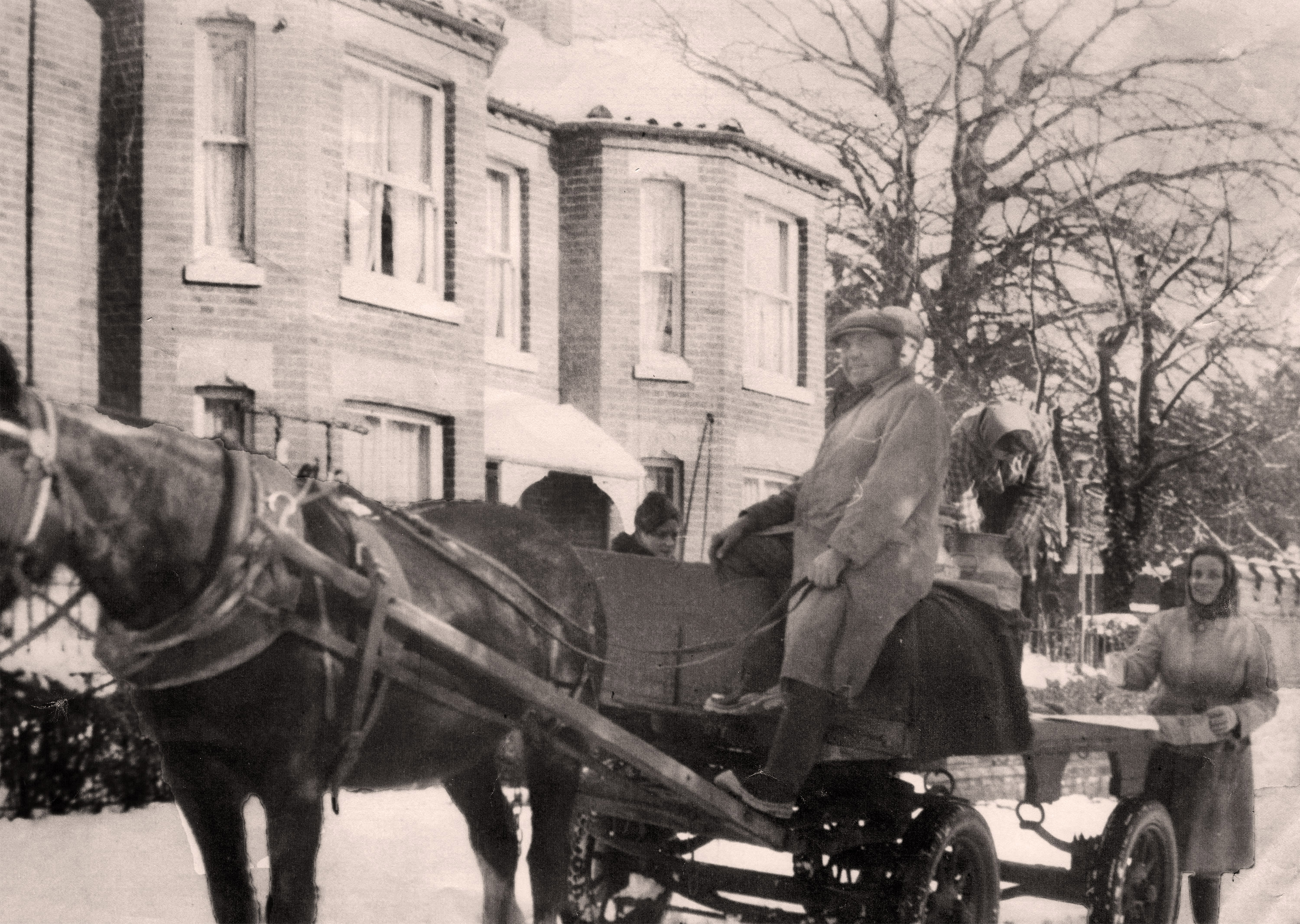 Dereham Road in winter 1955 (est). Mr. Vout delivering milk from his horse drawn cart. The lady at the back of the cart is Cissy Laskey.