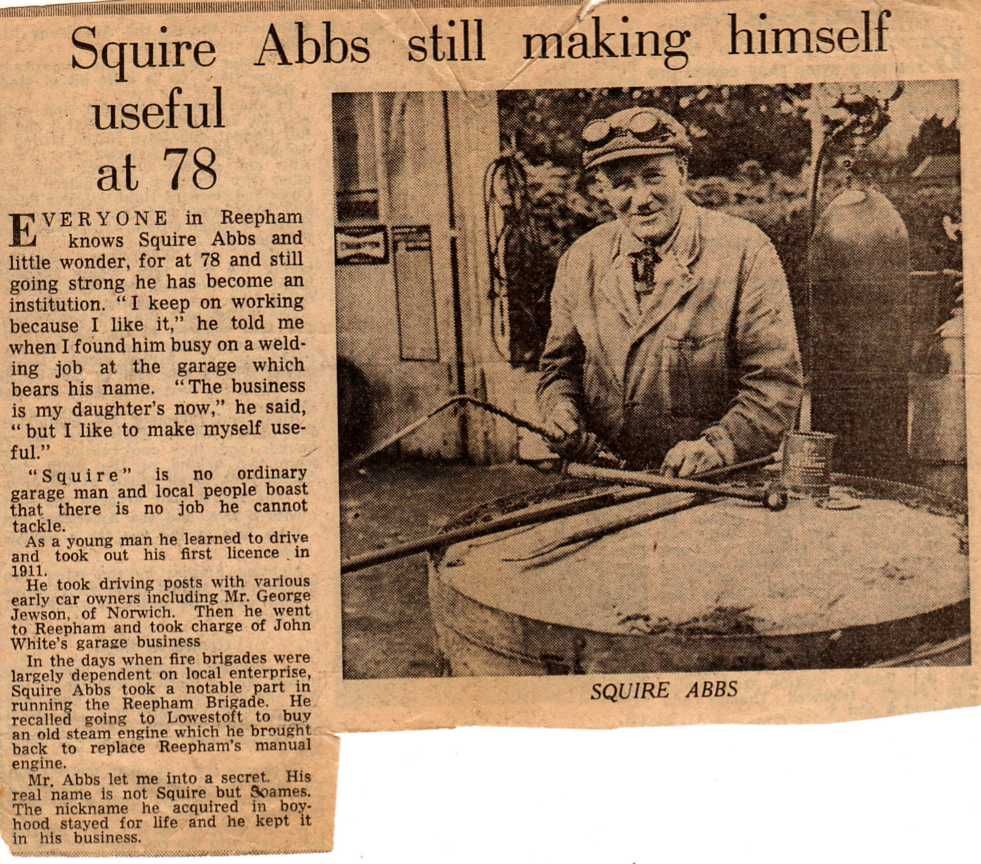 Newspaper cutting giving details about Squire Abbs, whose first name was actually Soames. Before setting up his own business he was in charge of John White's garage on the site which later became Massey & Bridges.