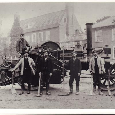 Work gang of seven men and their tools next to a steam roller in the early 1900s outside the Dial House, Market Place, before the conservatory was demolished.